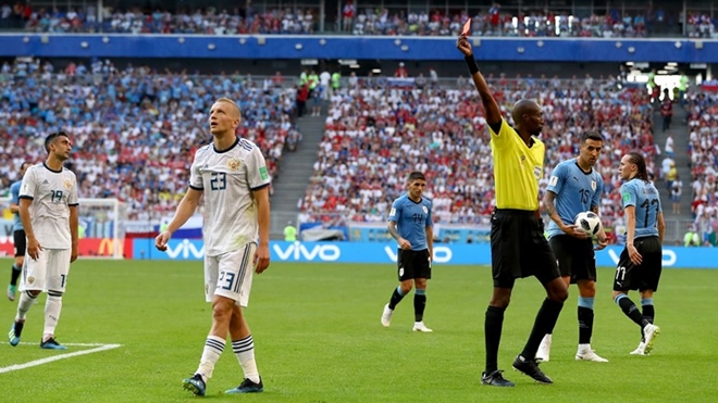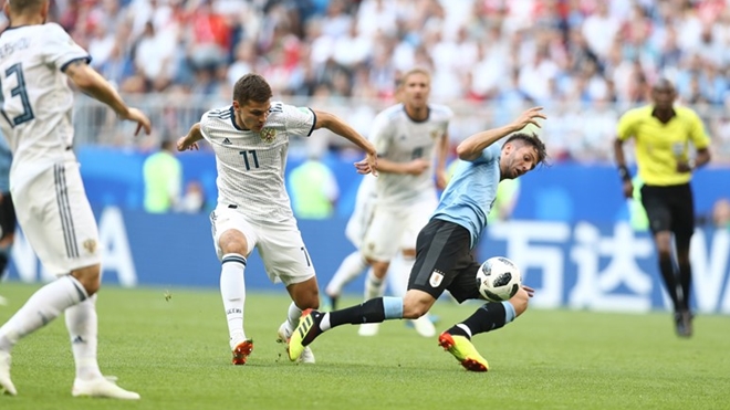 28': Suýt chút nữa đã có bàn thắng thứ 3 cho Uruguay nếu tiền vệ Zobnin không lăn xả pha bóng ngay trong chân cầu thủ Uruguay.