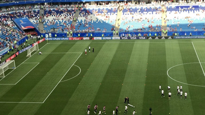 12': Nga được hưởng quả phạt gần điểm phạt góc. Cheryshev treo bóng bổng vào vòng cấm, nhưng bị hậu vệ Urguay phá ra.