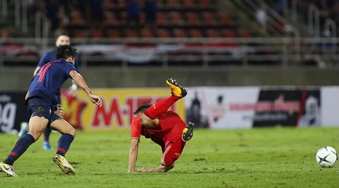 52': Thitiphan có pha đạp chân vào đùi Quế Ngọc Hải rất nguy hiểm nhưng trọng tài chính lại không phạt thẻ vàng.