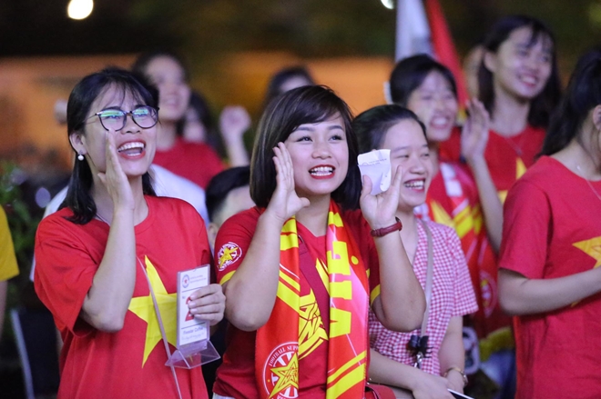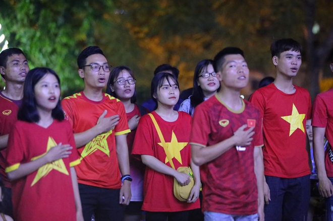 | Các CĐV Việt Nam cùng hát Quốc ca nhằm truyền lửa cho thầy trò HLV Park Hang-seo. |