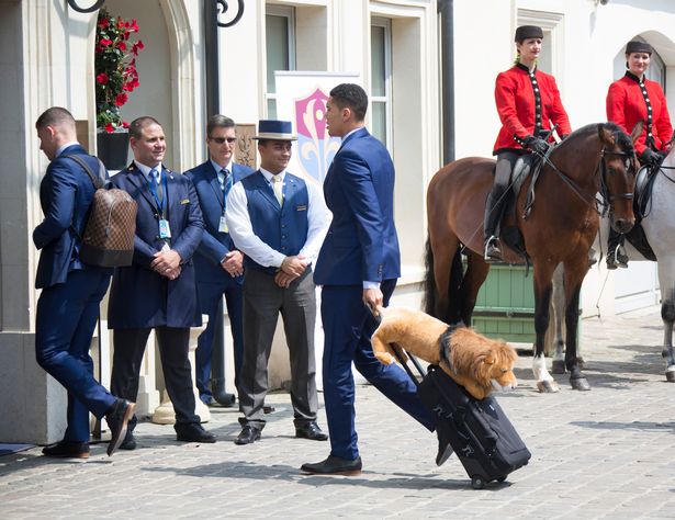 Cầu thủ đang khoác áo MU rời xe bus chở đội tuyển Anh khi chú sử tử bông Leo trên tay cùng với các đồng đội turridge, Vardy, Joe Hart Kyle Walker.