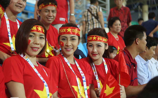 Cựu nữ hoàng điền kinh Đông Nam Á Vũ Thị Hương cùng Hoa hậu Thu Thảo, Á hậu Tú Anh (từ trái sang) cũng có mặt trên khán đài Bishan để cổ vũ thầy trò HLV Miura. Ảnh: VNE.