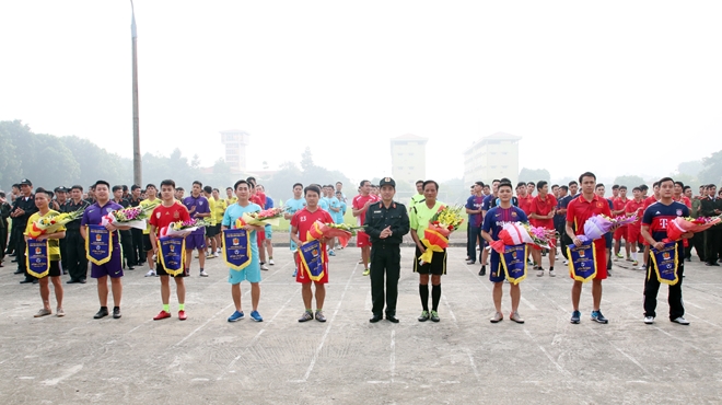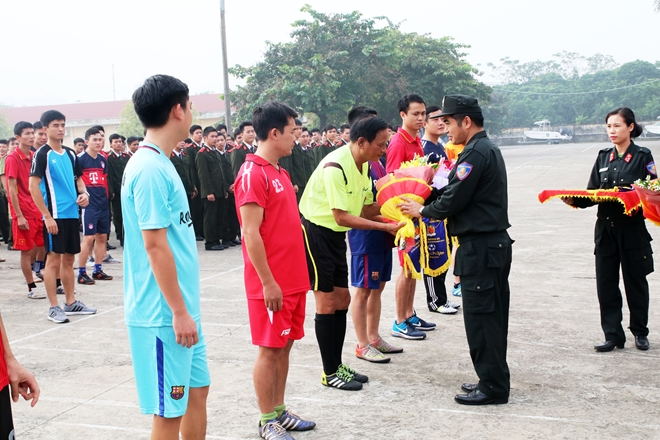 | Thượng tá Phan Công Côn, Giám đốc Trung tâm Huấn luyện và Bồi dưỡng nghiệp vụ trao hoa, tặng cờ lưu niệm tới trọng tài và các đội tuyển tham gia giải đấu. |