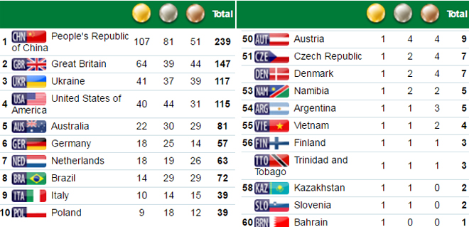 Xếp thứ nhất toàn đoàn là đoàn thể thao Trung Quốc với 107 HCV, 81 HCB, 51 HCĐ. Đoàn thể thao Anh xếp thứ 2 với 64 HCV, 39 HCB, 44 HCĐ. Đứng thứ 3 là đoàn Ukraine với 41 HCV, 37 HCB, 39 HCĐ. Chủ nhà Brazil xếp thứ 8 với 14 HCV, 29 HCB, 29 HCĐ.