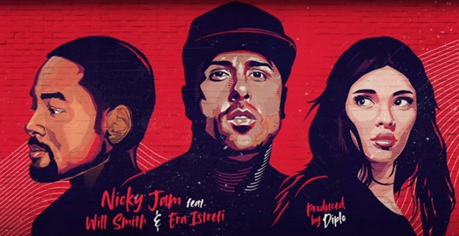 | Bộ ba Will Smith, Nicky jam và Era Istrefi. Ảnh: WC 2018 |