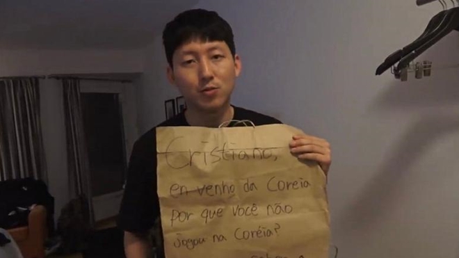 | Kwak Ji-Hyuk với tấm biểu ngữ bằng tiếng Bồ Đào Nha. Ảnh: Euronew.