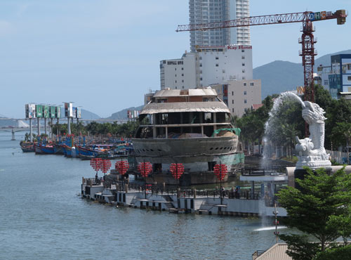 | Bến du thuyền kết hợp nhà hàng- cà phê ở bờ Đông Sông Hàn gây ảnh hưởng xấu đến cảnh quan dòng sông. |