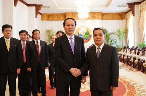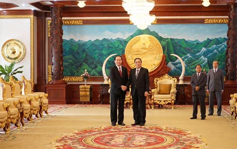 | Bộ trưởng Trần Đại Quang chào xã giao đồng chí Thủ tướng Chính phủ nước CHDCND Lào Thoong-sỉnh Thăm-ma-vông. |