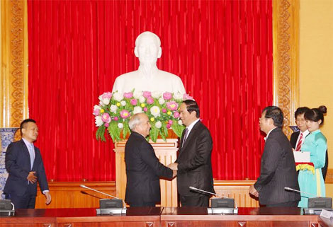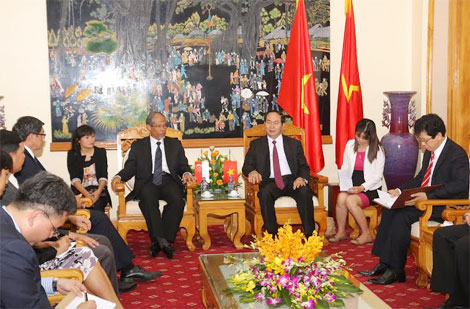 | Bộ trưởng Trần Đại Quang; ngài Masagos Zulkifli, Bộ trưởng Văn phòng Thủ tướng, Bộ trưởng thứ hai Bộ Nội vụ và Bộ Ngoại giao Singapore tại buổi tiếp. Ảnh Việt Hưng. |