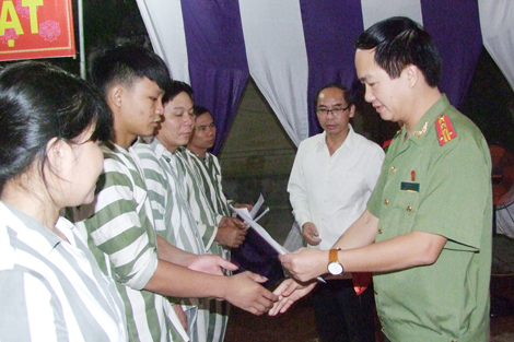 | Đại tá Lê Văn Sao, Giám đốc Công an tỉnh Hà Tĩnh trao quyết định đặc xá cho các phạm nhân. |