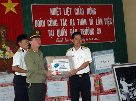| Lãnh đạo Báo CAND tặng quà, thăm hỏi cán bộ, chiến sĩ trên đảo Trường Sa. |