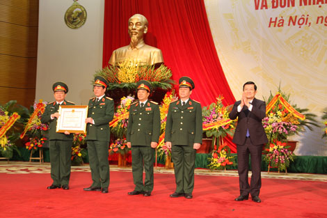| Chủ tịch nước gắn Huân chương Hồ Chí Minh- phần thưởng cao quý của Đảng và Nhà nước cho Tổng cục Chính trị. Ảnh Việt Hưng. |