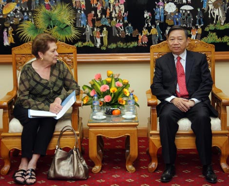 | Thứ trưởng Tô Lâm; bà Ann M.Griffiths, Giám đốc điều hành Liên đoàn các gia đình tìm kiếm quân nhân Mỹ bị mất tích trong chiến tranh ở Việt Nam tại buổi tiếp. Ảnh Việt Hưng. |