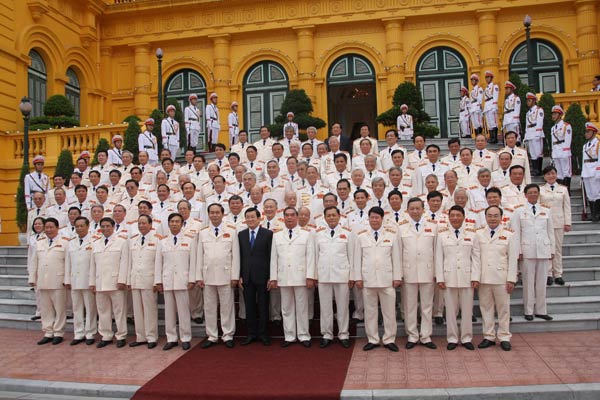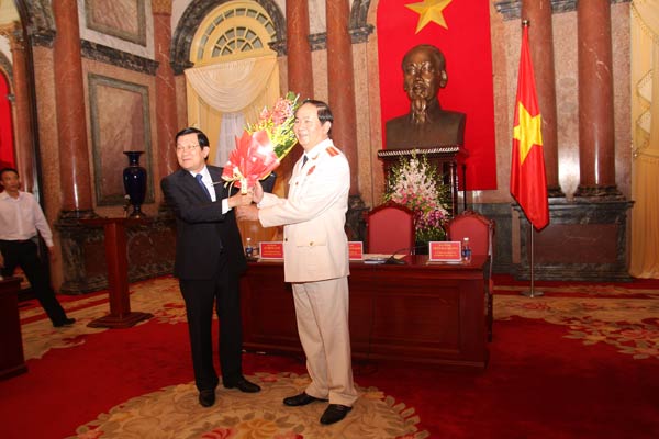 | Chủ tịch nước Trương Tấn Sang tặng hoa chúc mừng lực lượng CAND và các Tướng lĩnh CAND qua các thời kỳ. Ảnh Việt Hưng. |
