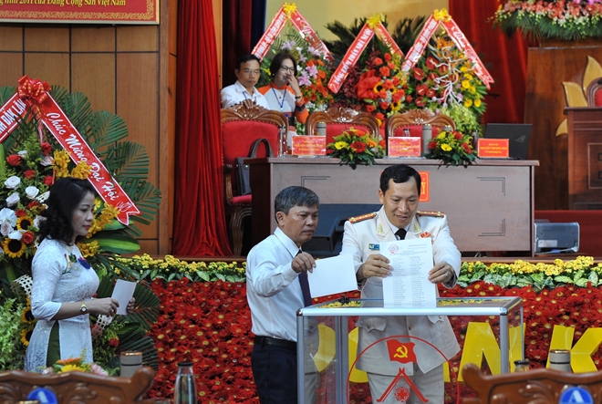 | Đại biểu Đoàn Chủ tịch bỏ phiếu bầu Ban Chấp hành Đảng bộ khoá XVII |
