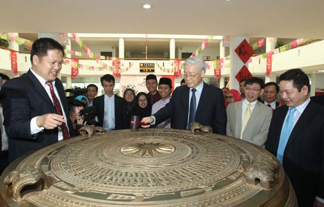 | Tổng Bí thư Nguyễn Phú Trọng thăm Trường Đại học FPT tại Khu công nghệ cao Hòa Lạc. Ảnh : TTXVN. |