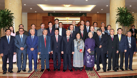 | Tổng Bí thư Nguyễn Phú Trọng tiếp cán bộ ngoại giao tiêu biểu qua các thời kỳ. |