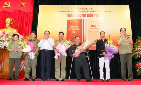 Các đại diện của Bộ Công an và Ban Dân vận TƯ tặng hoa đại diện những tấm gương tiêu biểu trong cuốn “Tỏa sáng giữa đời thường”. |