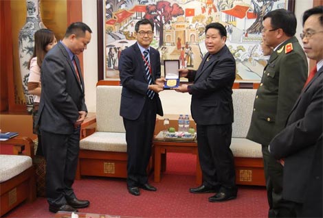 | Thứ trưởng Bùi Văn Thành tặng quà Tổng Giám đốc Tập đoàn Lotte của Hàn Quốc tại Việt Nam Lee Jong Kook. Ảnh Việt Hưng. |