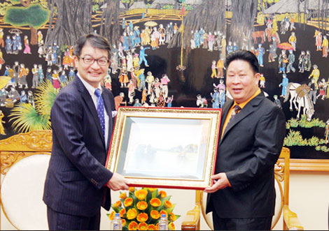 | Thứ trưởng Bùi Văn Thành tặng quà lưu niệm Giám đốc cao cấp Tập đoàn Toyota của Nhật Bản Konishi. |