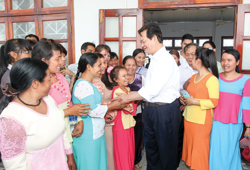 | Thủ tướng Nguyễn Tấn Dũng thăm hỏi bà con xã Phước Trung, huyện Bắc Ái, tỉnh Ninh Thuận. Ảnh: TTXVN. |