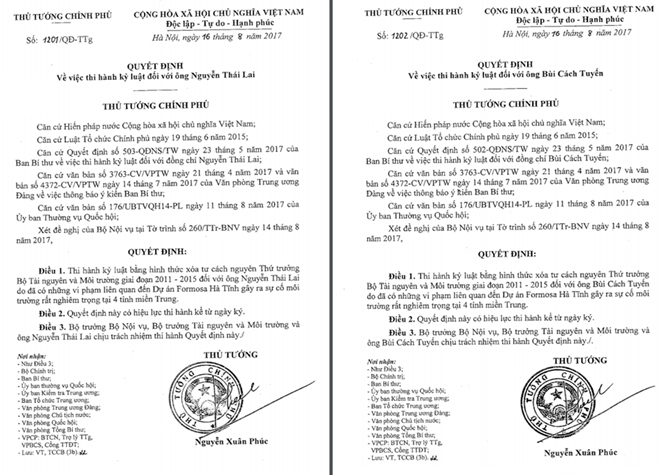 | Quyết định xóa tư cách nguyên Thứ trưởng của ông Nguyễn Thái Lai và ông Bùi Cách Tuyến |