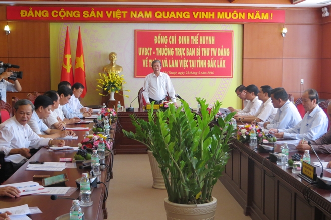 Chiều 23-5, Đoàn công tác của Trung ương do đồng chí Đinh Thế Huynh, Ủy viên Bộ Chính trị, Thường trực Ban Bí thư làm Trưởng đoàn đã có buổi làm việc với Ban Thường vụ Tỉnh ủy Đắk Lắk về tình hình triển khai, tổ chức thực hiện Nghị quyết Đại hội lần thứ XII của Đảng và Nghị quyết Đại hội Đảng bộ tỉnh Đắk Lắk lần thứ XVI.