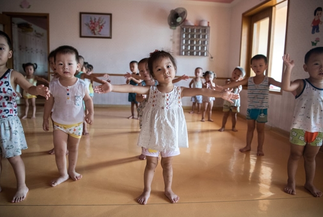 Những "vũ công nhí" tại một trường mầm non thuộc nhà máy lụa Kim Jong-suk đang luyện tập cho màn trình diễn sắp tới của mình. |