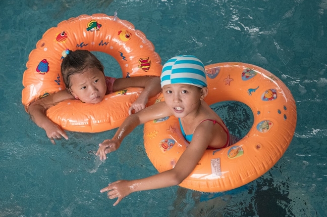 Hai em bé Triều Tiên thích thú tận hưởng mùa hè mát lạnh tại bể bơi Munsu. |
