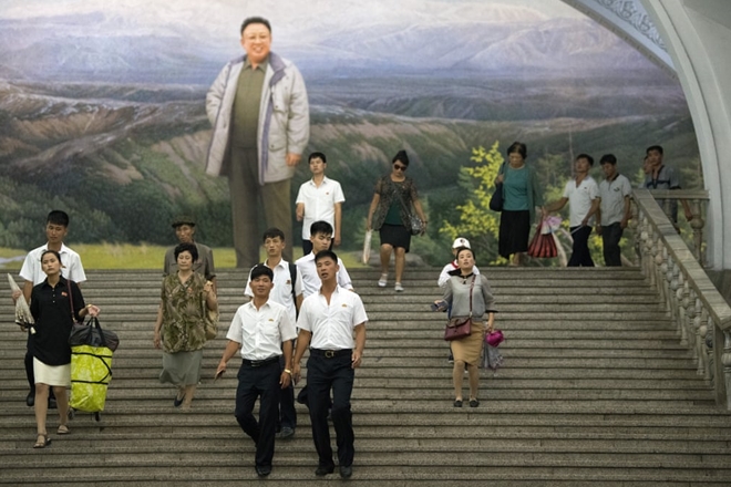 Bức tranh lớn về cố lãnh đạo Kim Jong-Il được đặt tại khu vực ga tàu điện trong trung tâm thủ đô Bình Nhưỡng. Bức ảnh được nhiếp ảnh gia chụp vào thời điểm người dân đang hối hả rảo bước để kịp chuyến tàu điện tới nơi làm việc. |