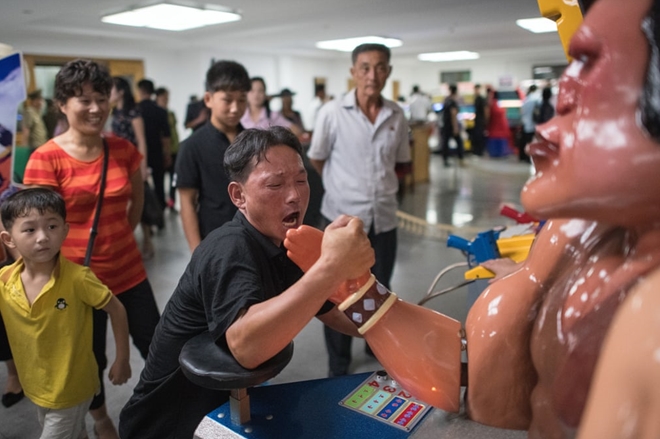 Cuộc đọ sức đầy gay cấn giữa một người đàn ông Triều Tiên và một "đô vật" điện tử tại khu giải trí thuộc Công viên Tuổi trẻ Kaeson thu hút sự chú ý của các khách tham quan. |