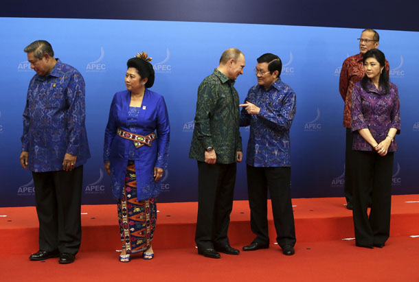 | APEC 2013 tổ chức tại Indonesia đánh dấu sự trở lại của truyền thống mặc trang phục nước chủ nhà trong phiên chụp ảnh toàn thể, sau ba năm bị gián đoạn. Lần này, nước chủ nhà Indonesia đã lựa chọn trang phục truyền thống làm từ vải endek của người Bali, được dệt bằng tay và thường sử dụng trong các phong tục Ấn Độ giáo. Ảnh: Getty |