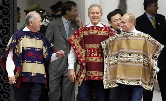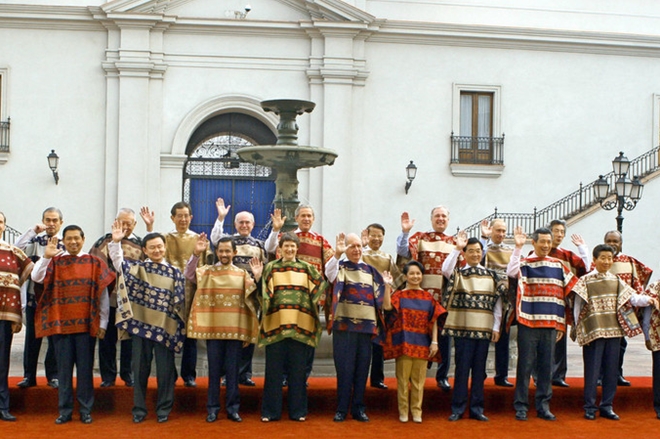| Bức ảnh này được chụp tại kỳ APEC 2004 ở Santiago, Chile. Các lãnh đạo diện chiếc khăn chamanto theo phong cách truyền thống của Chile. Chamanto được dệt từ lụa và len, có thể sử dụng được cả hai mặt. Ảnh: Reuters |