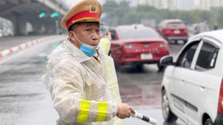 CSGT chốt trực trong mưa rét điều tiết giao thông đón người dân trở về Thủ đô