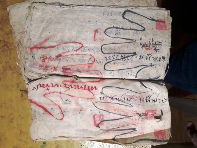 Nhẹ tay lật giở từng trang, tôi ấn tượng với hai trang giấy mở rộng có in ba hình bàn tay xòe rõ ngón. Một bàn in mực đỏ, hai bàn màu đen, to như bàn tay thật, xung quanh có chú thích bằng các chữ Thái.