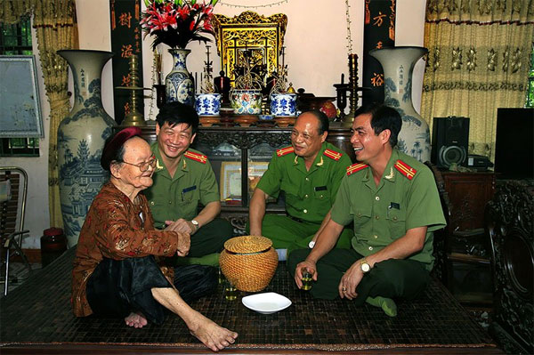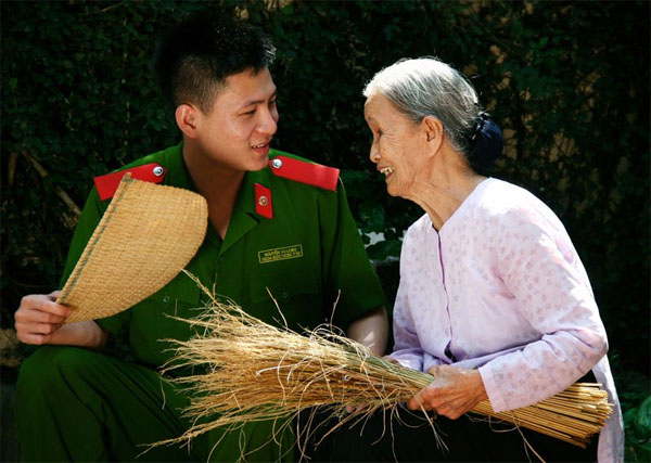 | Chiến sĩ Long tâm sự cùng bà mẹ Việt Nam anh hùng. |