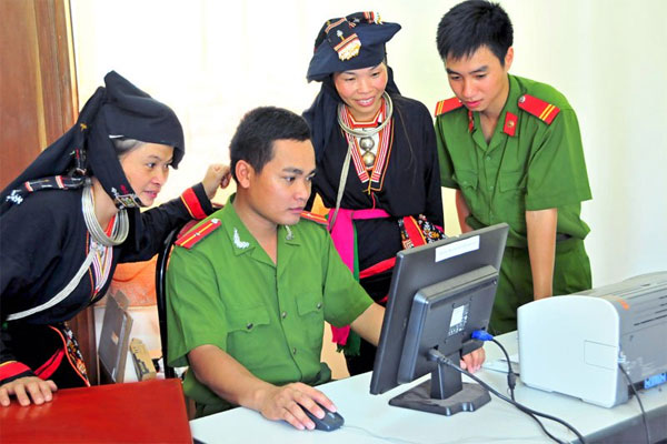 | Công an huyện Ba Vì hướng dẫn phụ nữ dân tộc sử dụng máy tính. |
