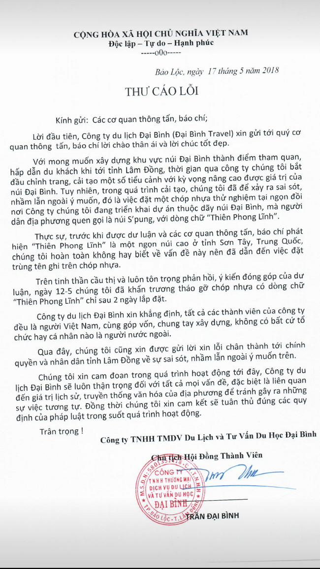 “Trên tinh thần cầu thị và luôn tôn trọng phản hồi, ý kiến đóng góp của dư luận, ngày 12-5 chúng tôi đã khẩn trương tháo gỡ chóp nhựa có dòng chữ “Thiên Phong Lĩnh” chỉ sau 2 ngày lắp đặt”, thư xin lỗi viết.