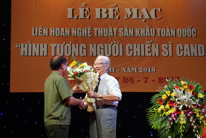Phần đánh giá kết quả của GS Tất Thắng, Nhà Lý luận - Phê bình Sân khấu, Chủ tịch Hội đồng Giám khảo luôn bị ngắt quãng bởi những tràng pháo tay của khán giả. (Ảnh Trung tướng Bùi Bá Định, Phó tổng Cục trưởng Tổng cục Chính trị CAND, Trưởng Ban tổ chức tặng hoa GS Tất Thắng).