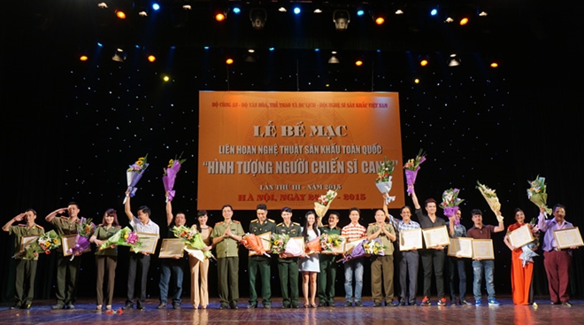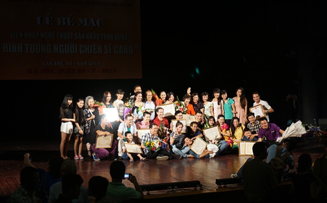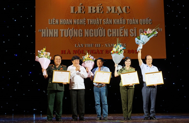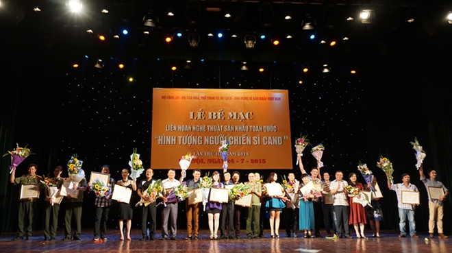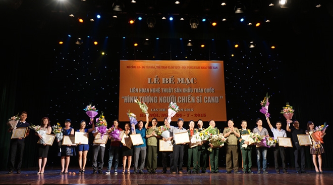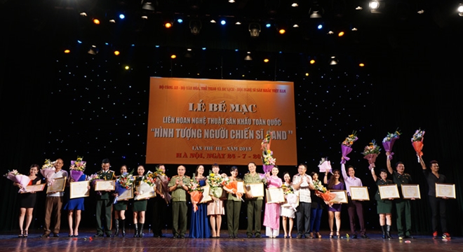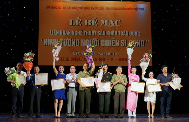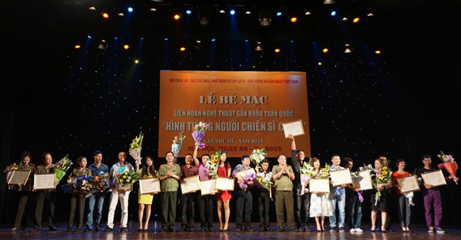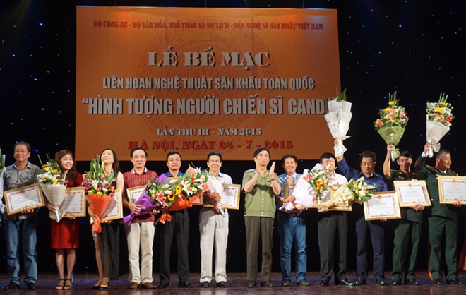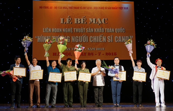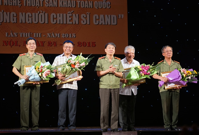 NSƯT Lê Chức, Phó Chủ tịch Hội Nghệ sĩ Sân khấu Việt Nam lên trao Bằng khen tặng các nghệ sĩ có vai diễn hay nhất về hình tượng người chiến sĩ CAND; đại diện Dàn nhạc Nhà hát Chèo Quân đội và đại diện Vũ đoàn của Nhà hát Tuổi trẻ.