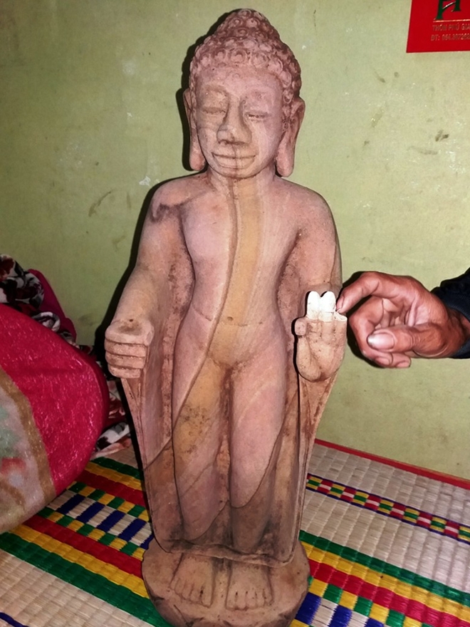 | Bức tượng Phật bằng đá nặng khoảng 50kg được ông Tứ phát hiện lúc đào vườn. Ảnh: Tiến Vinh. |