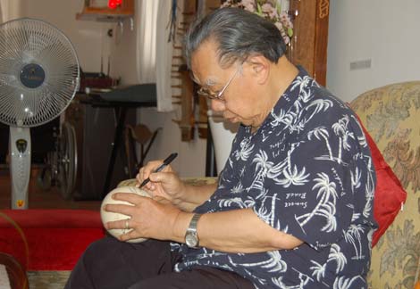 | GS Trần Văn Khê đang ký lên vỏ quả trứng đà điểu của nhạc sỹ Lân Cường. |