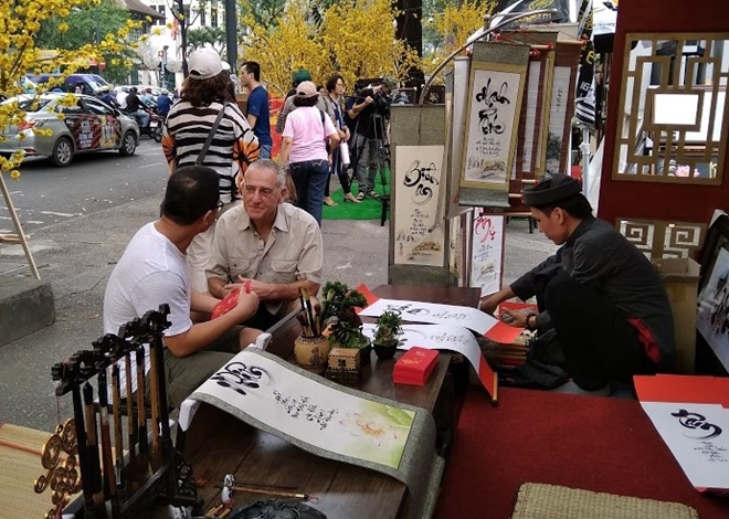 | Một người nước ngoài đang được giải thích về thú xin chữ ngày tết của người dân Việt Nam |