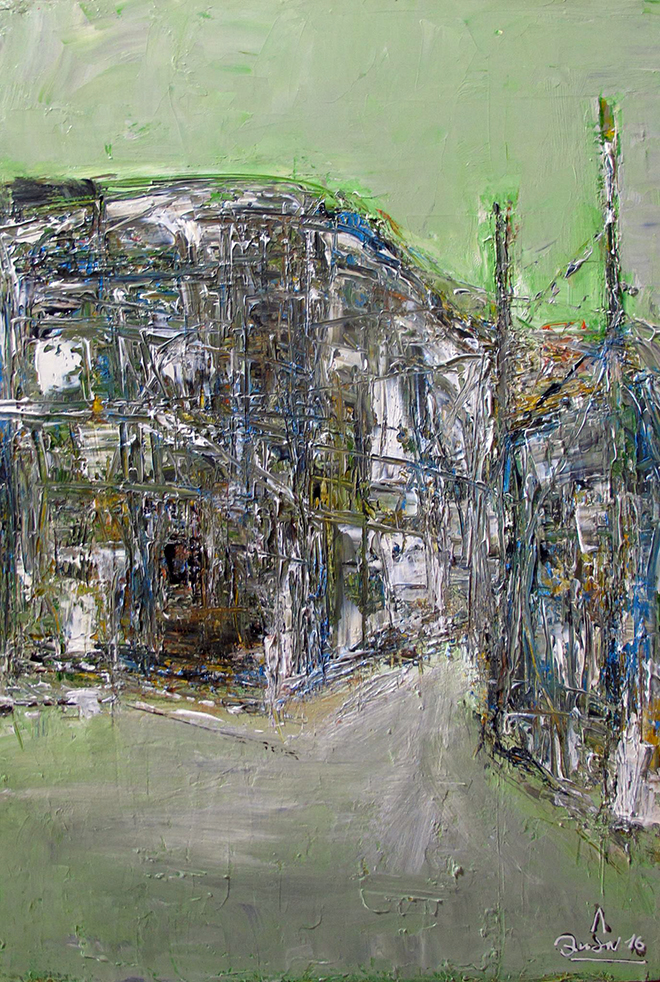 Họa sĩ Phạm Trần Quân lại gây ấn tượng thị giác bằng cách chia các đường nét, mảng màu xiên, dọc trong bức vẽ tạo nên chân dung phố của thời hiện đại đầy mảnh nối, mảng ghép. Người xem có cảm giác một không gian phố chật chội, bức bối trước sự cơi nới với đường dây điện chằng chịt. Phố với anh “như một cái giật mình, có lúc mê mải, có lúc hoang đường” trừu tượng mà vẫn hiển hiện trước mắt.
