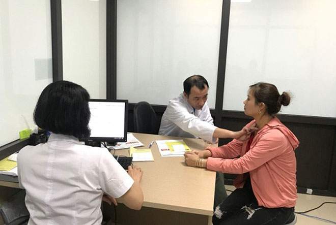| Bác sĩ Bệnh viện K thăm khám tuyến giáp cho bệnh nhân. |