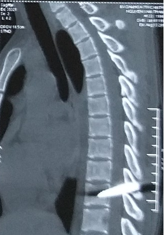 | Hình ảnh mũi dao đâm xuyên tủy bệnh nhên T. |