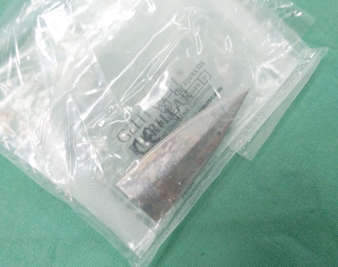 | Các BS lấy mui dao ra khỏi người bệnh nhân T. |