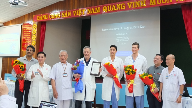 | Giáo sư Joe Gelman (thứ 4 từ trái sang) trong đợt hội thảo trao đổi kỹ thuật phẫu thuật hẹp niệu đạo với các bác sĩ BV Bình Dân. |