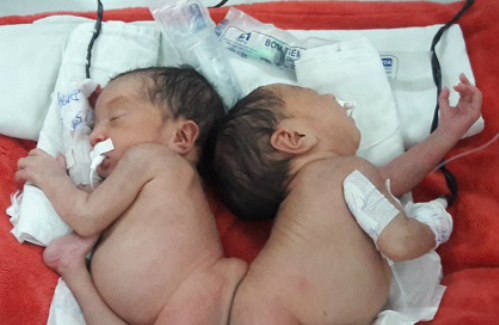 Cặp song sinh gái chào đời dính liền không có hậu môn