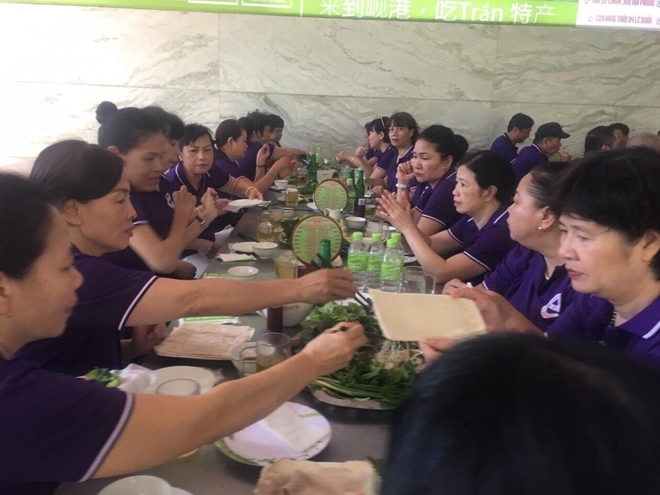 Sáng 10/8, sau khi ăn sáng tự chọn, mọi người đi tham quan một số điểm ở Đà Nẵng. Đến khoảng 12h, cả đoàn đến nhà hàng ẩm thực T. để ăn trưa. Tại đây, mỗi người ăn 1 đĩa bánh tráng cuốn thịt heo theo suất và nửa tô bún mắm nêm thịt heo quay.
